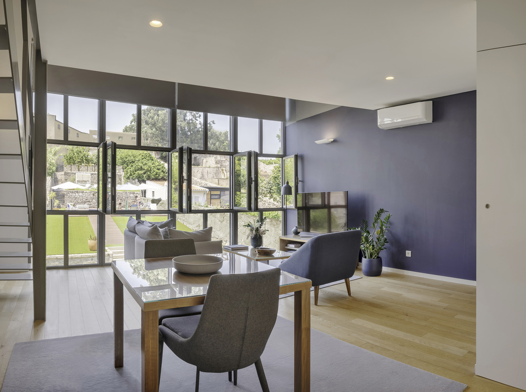 Duplex · Suite with Queen Size bed and bathroom with shower on the upper floor · Bathroom with shower on the lower floor · Fully equipped kitchenette · Free Wi-Fi Internet access · Dining area · Living area · Air conditioning Conditioning · In-room temperature control · Iron and ironing board · Pool towels · Wardrobe · TV with cable channels · Bluetooth Speaker · Espresso machine · Complimentary water, tea and coffee · Toiletries · Hairdryer · View garden and swimming pool · In-room safe · Elevator · First aid kit · Room area – 75 m²