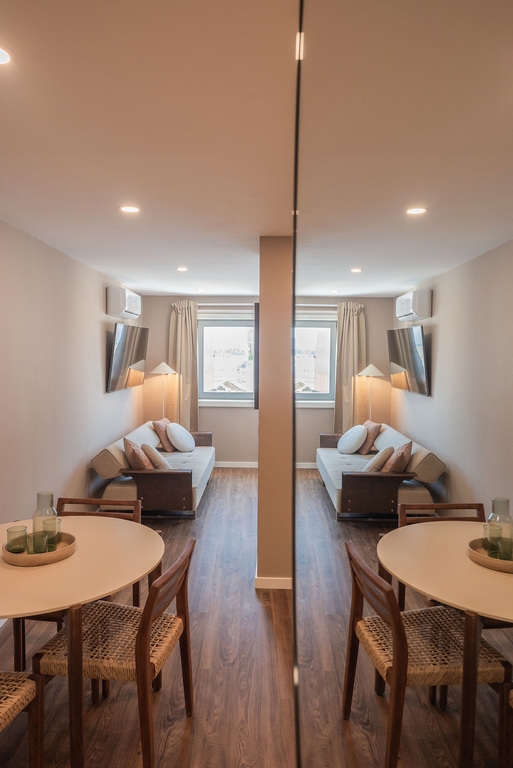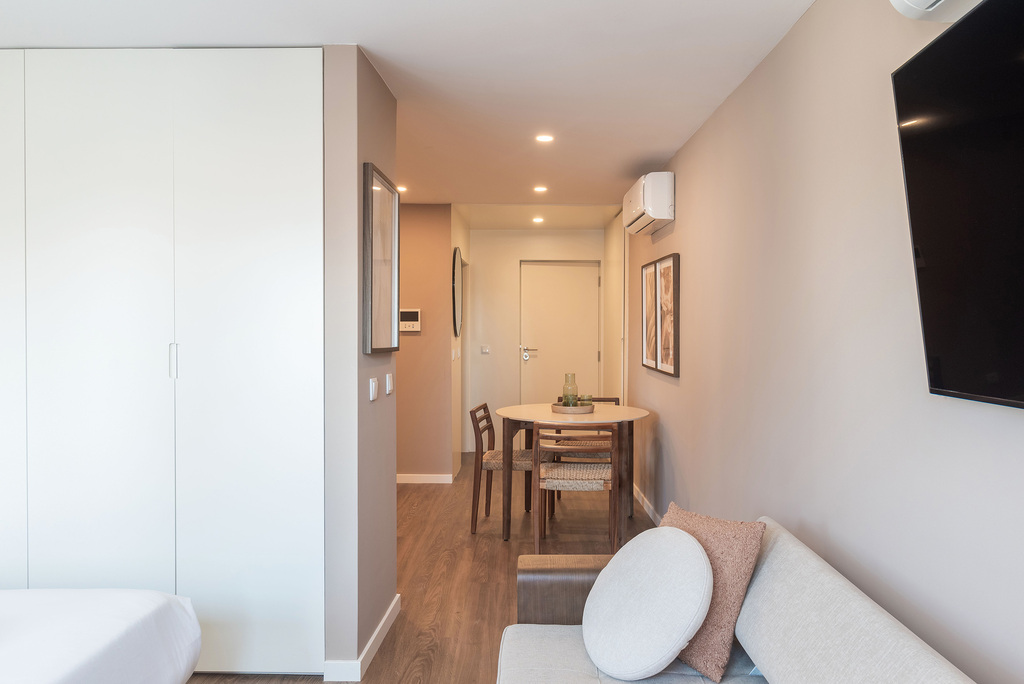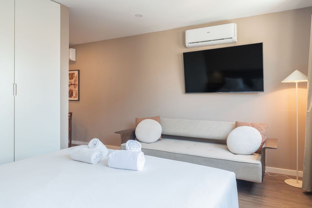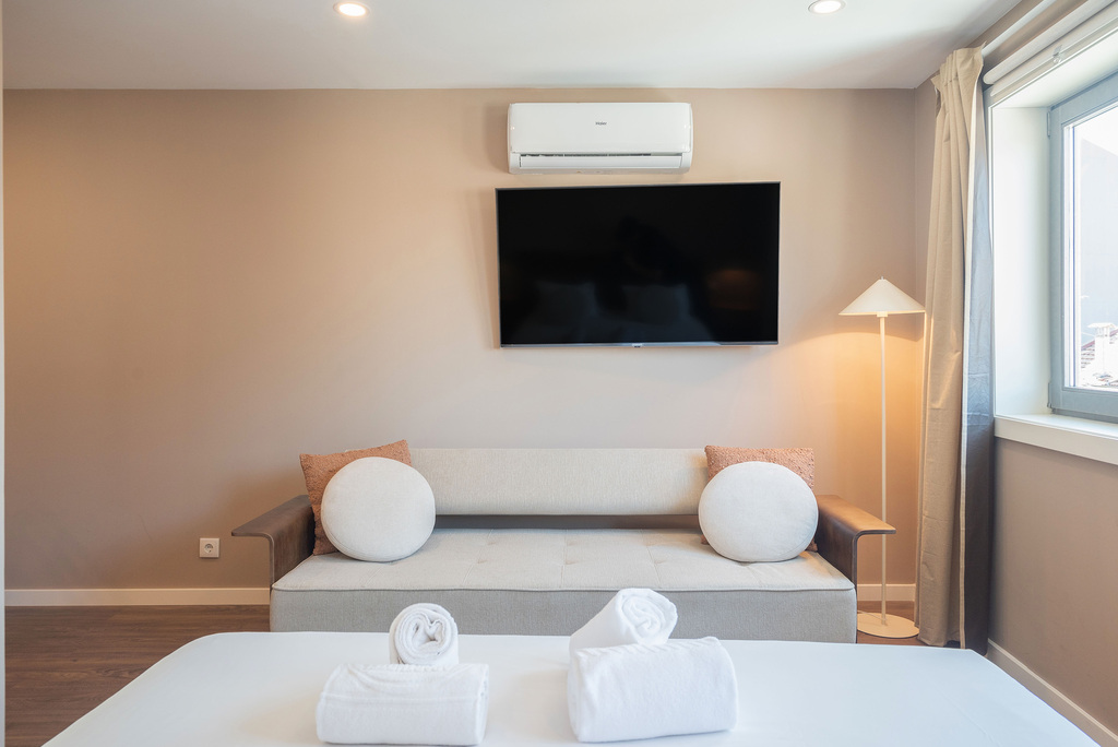 Situado no terceiro andar, este apartamento superior distingue-se pelo terraço com vista direta para a praça. Embora a zona seja animada durante o dia e início da noite, o movimento desaparece por volta das 23h e as janelas de alto desempenho acústico asseguram um ambiente interior particularmente silencioso. O apartamento dispõe de cozinha equipada, cama de casal de 160 cm e casa de banho espaçosa com duche amplo. Área: 33 m².